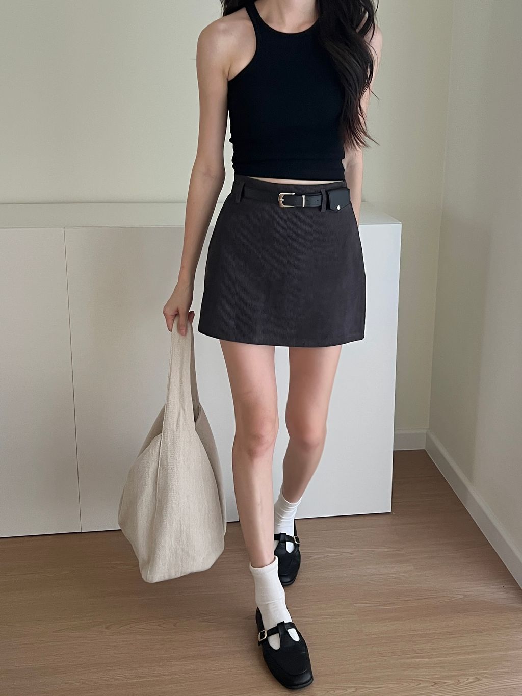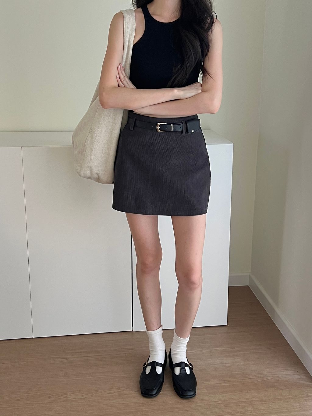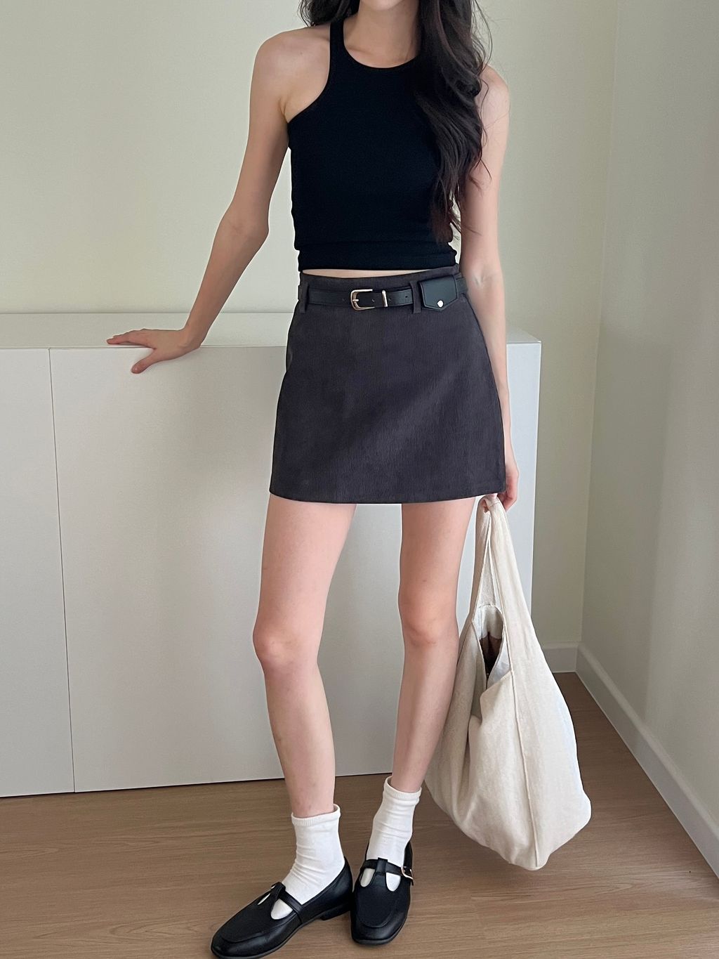 Corduroy Belted Skirt - Grey